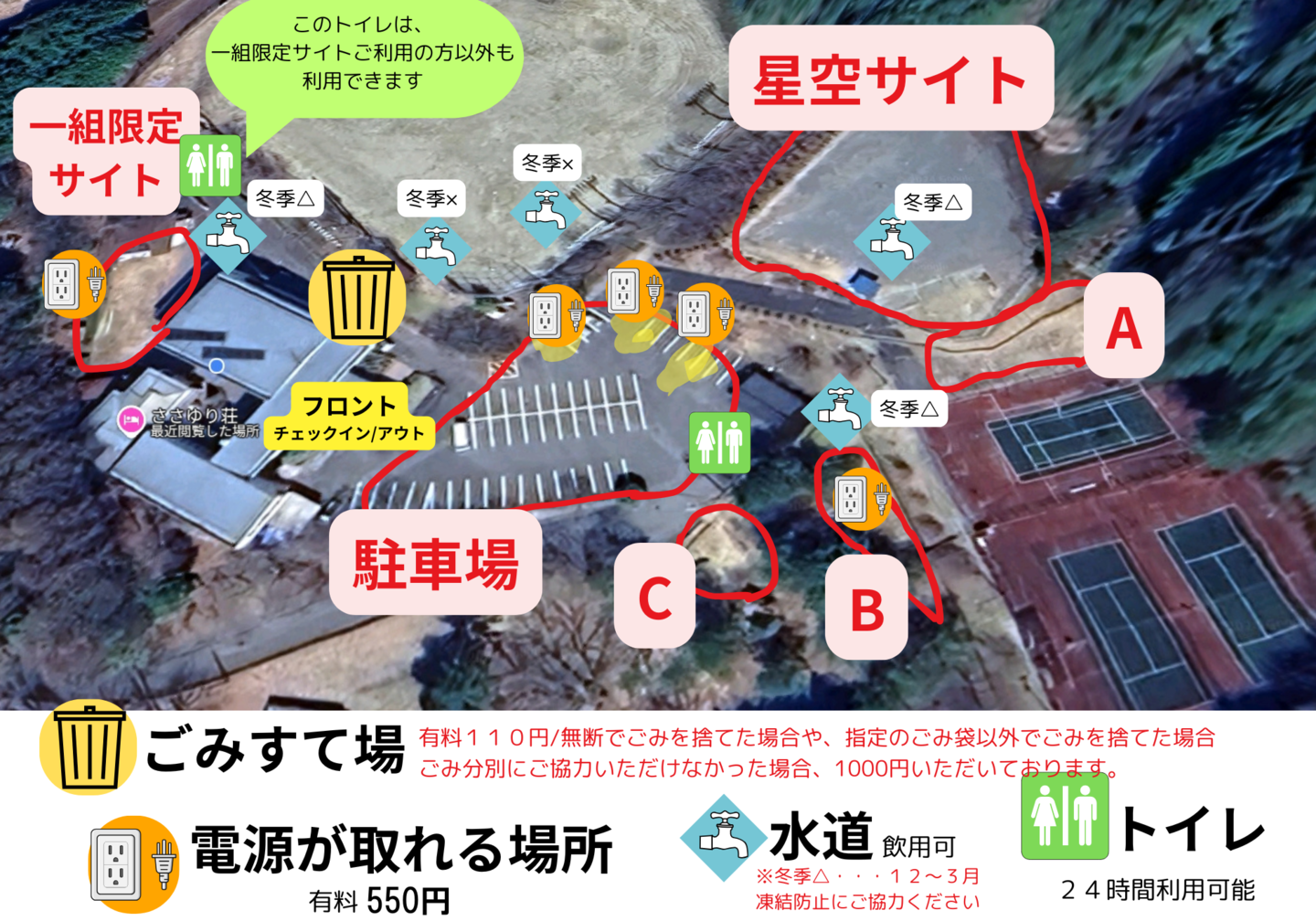 駐車場、Bサイト、Cサイトの方が ご利用できます。